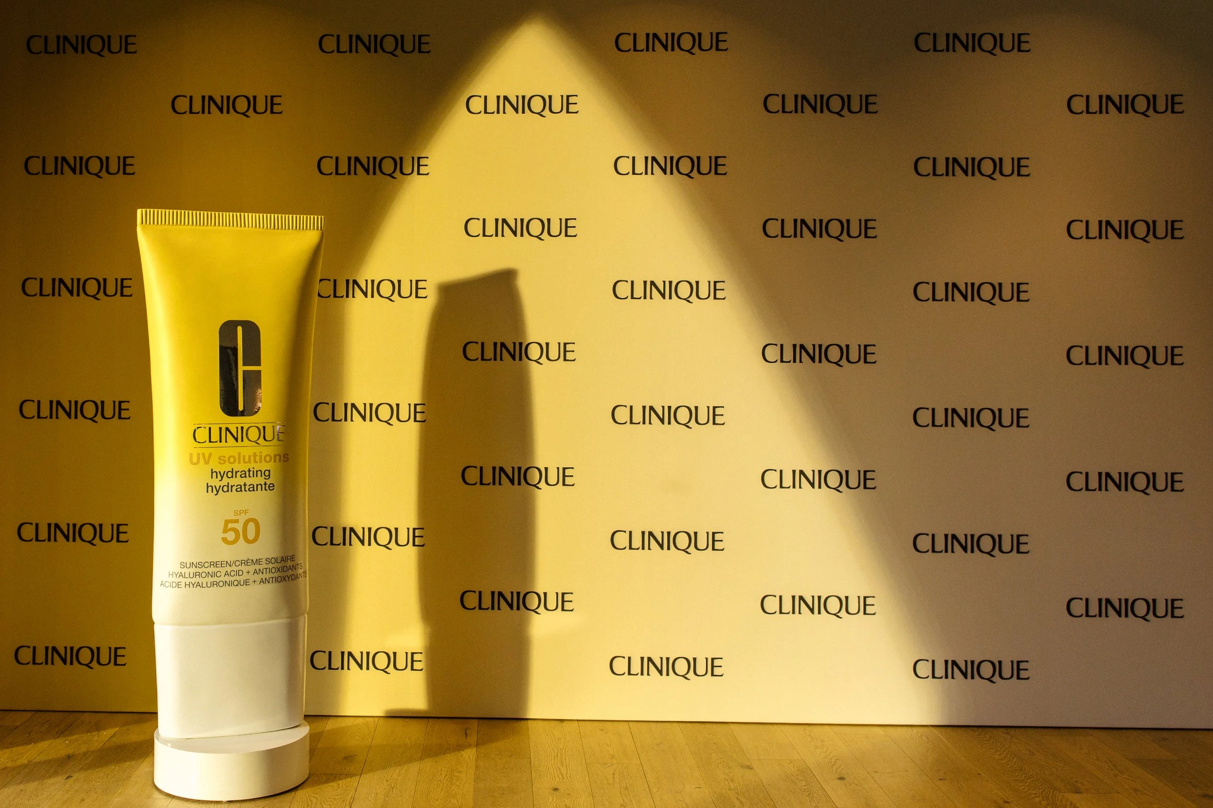 A larger than life Step & Repeat in Clinque’s UV Solutions’ yellow was fabricated in-situ at the Populus Hotel spanning the entire wall. A factice of the product was provided as a photo-moment prop.