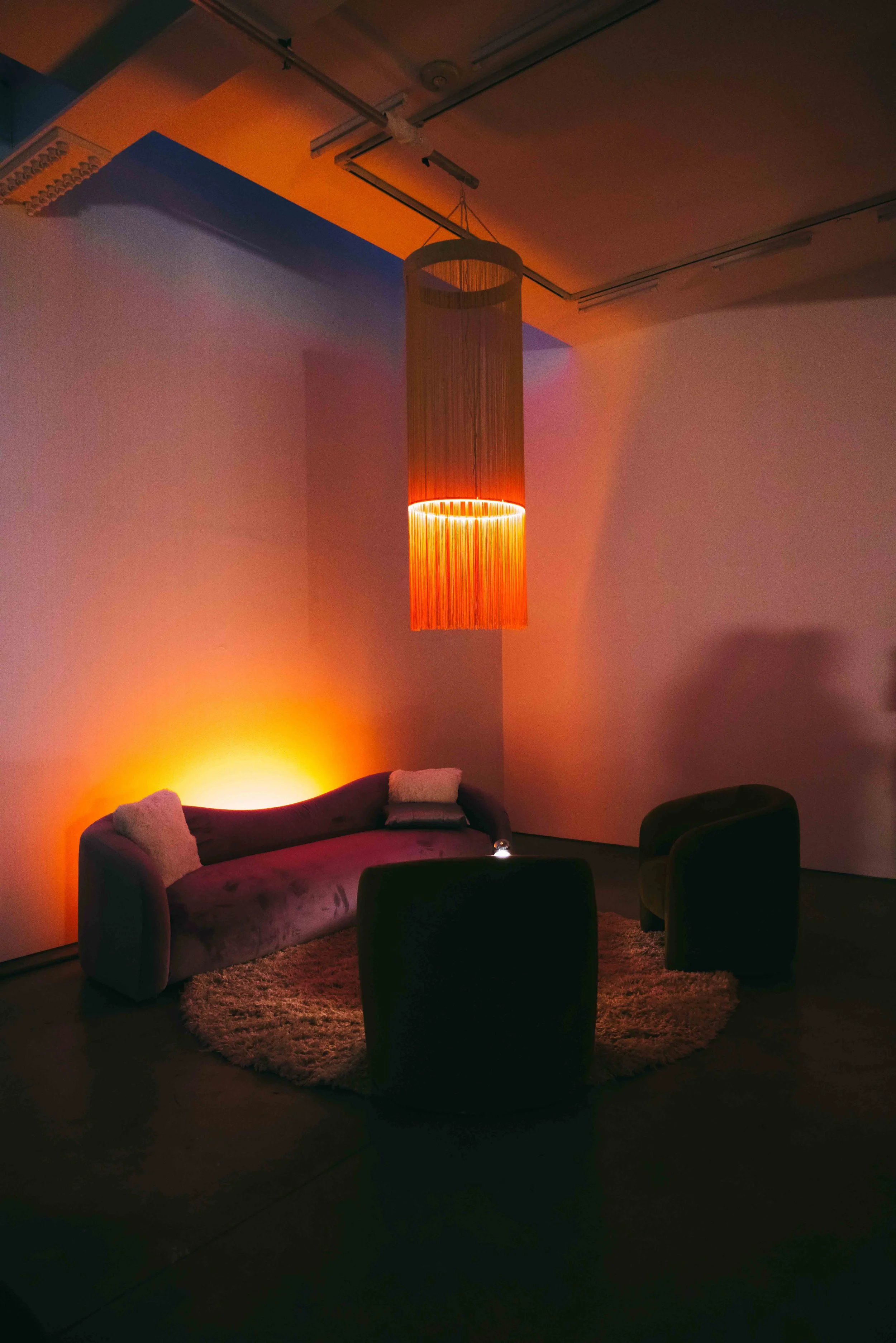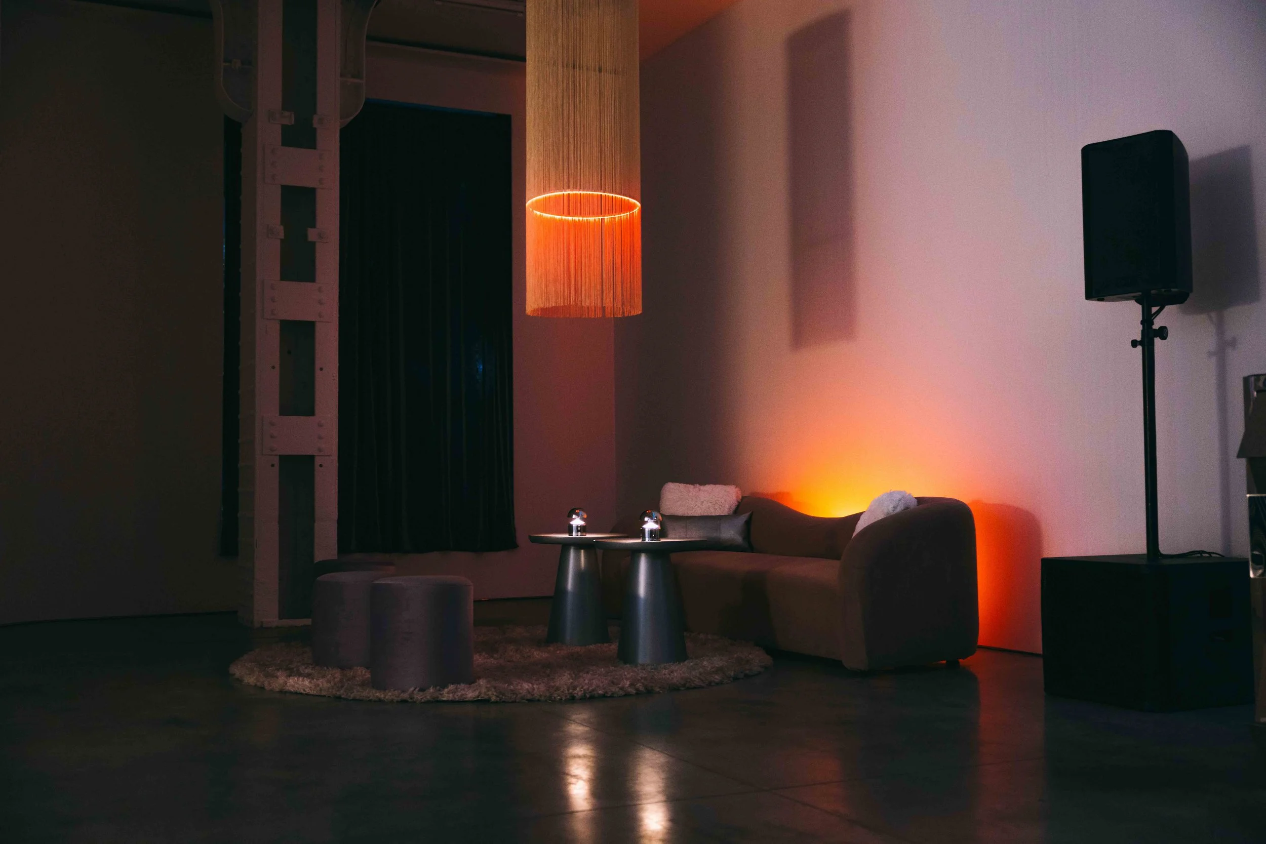 Guests entered through a shimmer‑wall step‑and‑repeat, then into a moody lounge of sculptural seating islands, rugs, and custom fabric chandeliers.