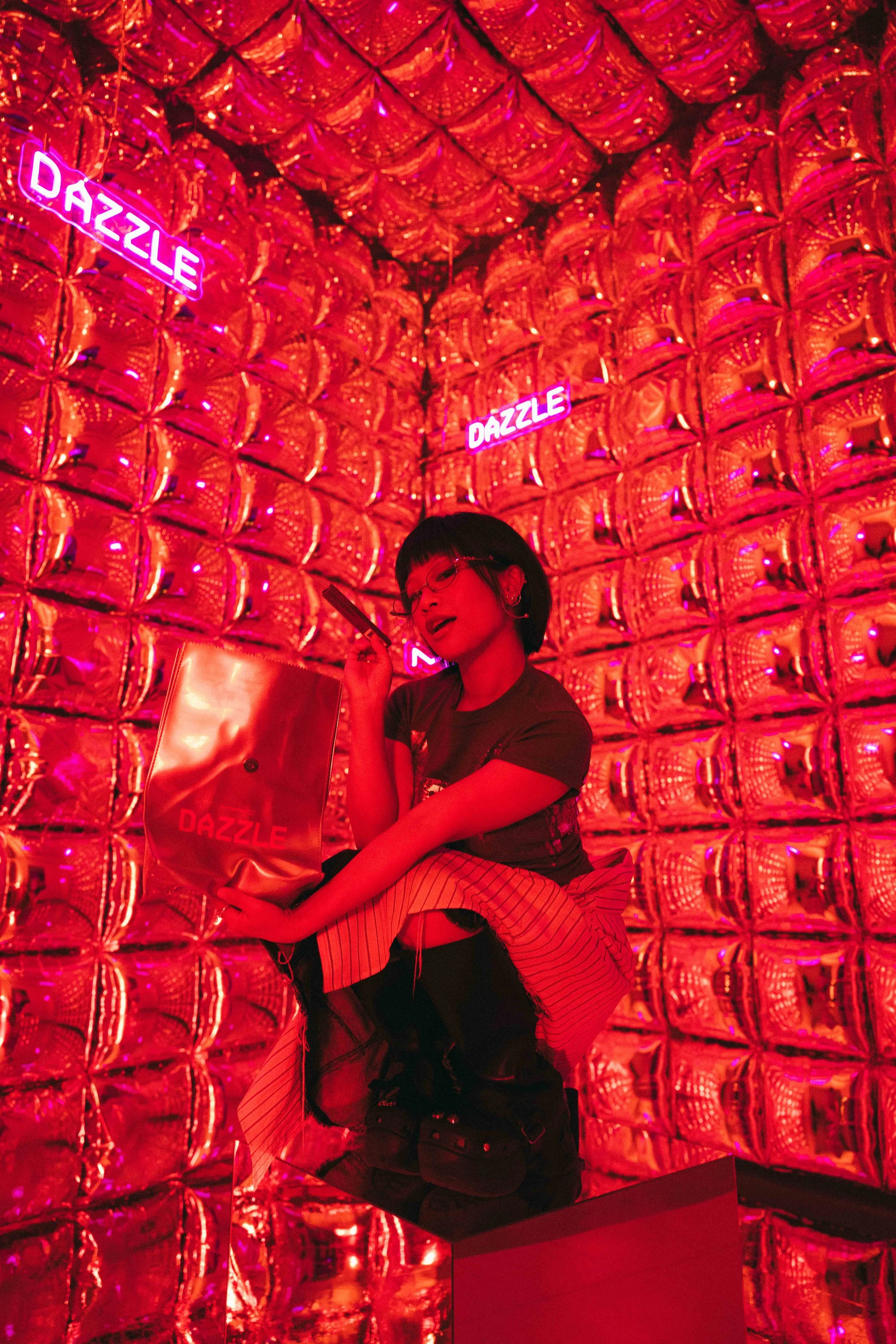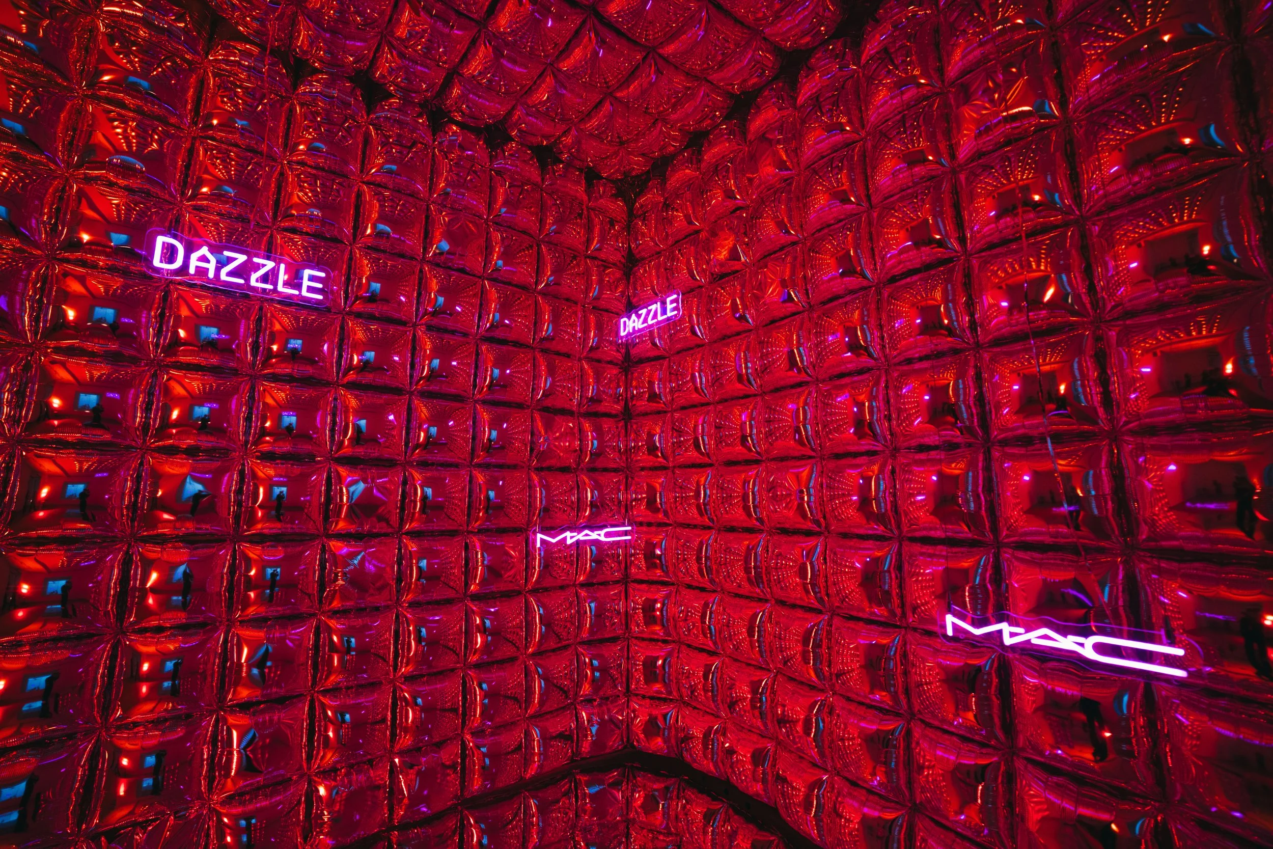 At corridor’s end, a wall‑to‑ceiling grid of mylar cubes created a convex mirror effect, finished with branded M·A·C and DAZZLE neon and a mirrored floor. The corner became a gravitational UGC zone, an infinite, photogenic shimmer box that guests returned to throughout the night.