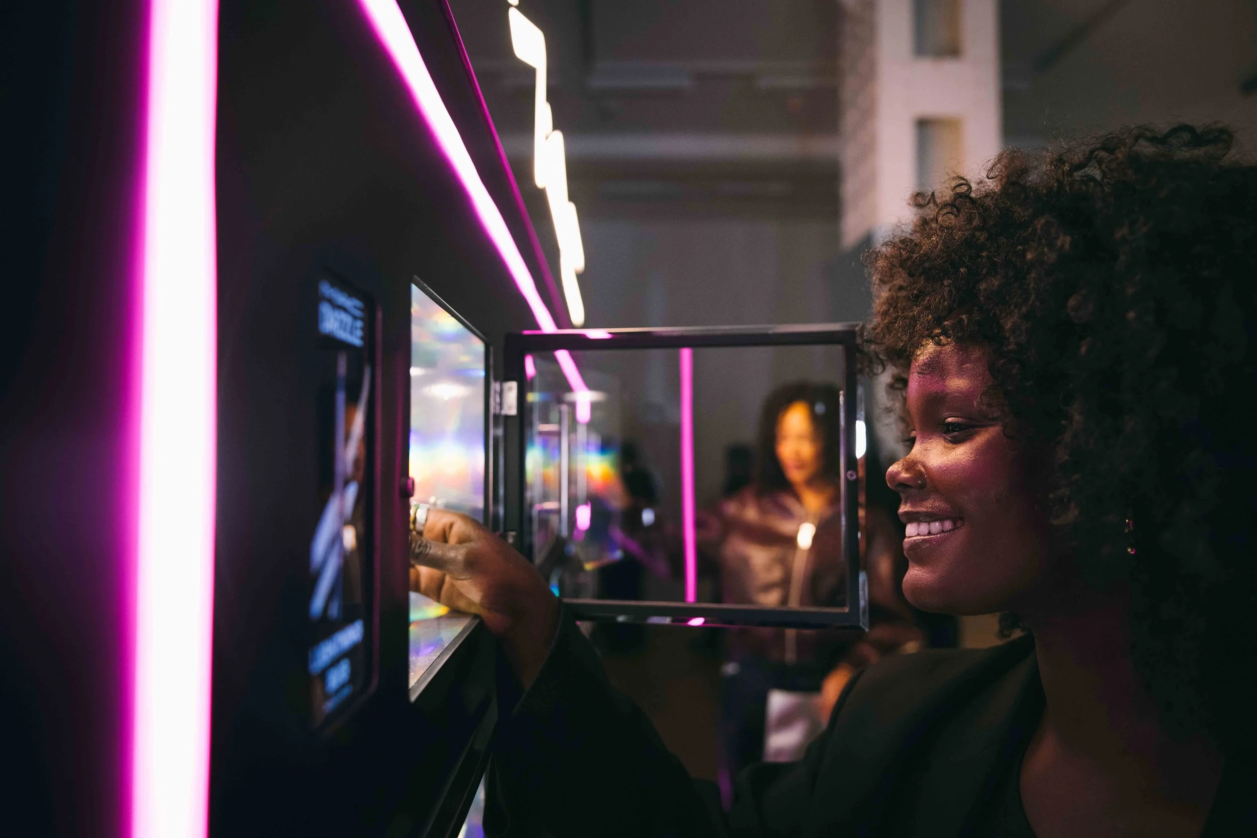The AUTOM•A•C worked like a magnet: guests clustered to sample, swatch, and be “vended” a shade by a white‑gloved hand; an unexpected, theatrical micro‑moment that amplified content capture.