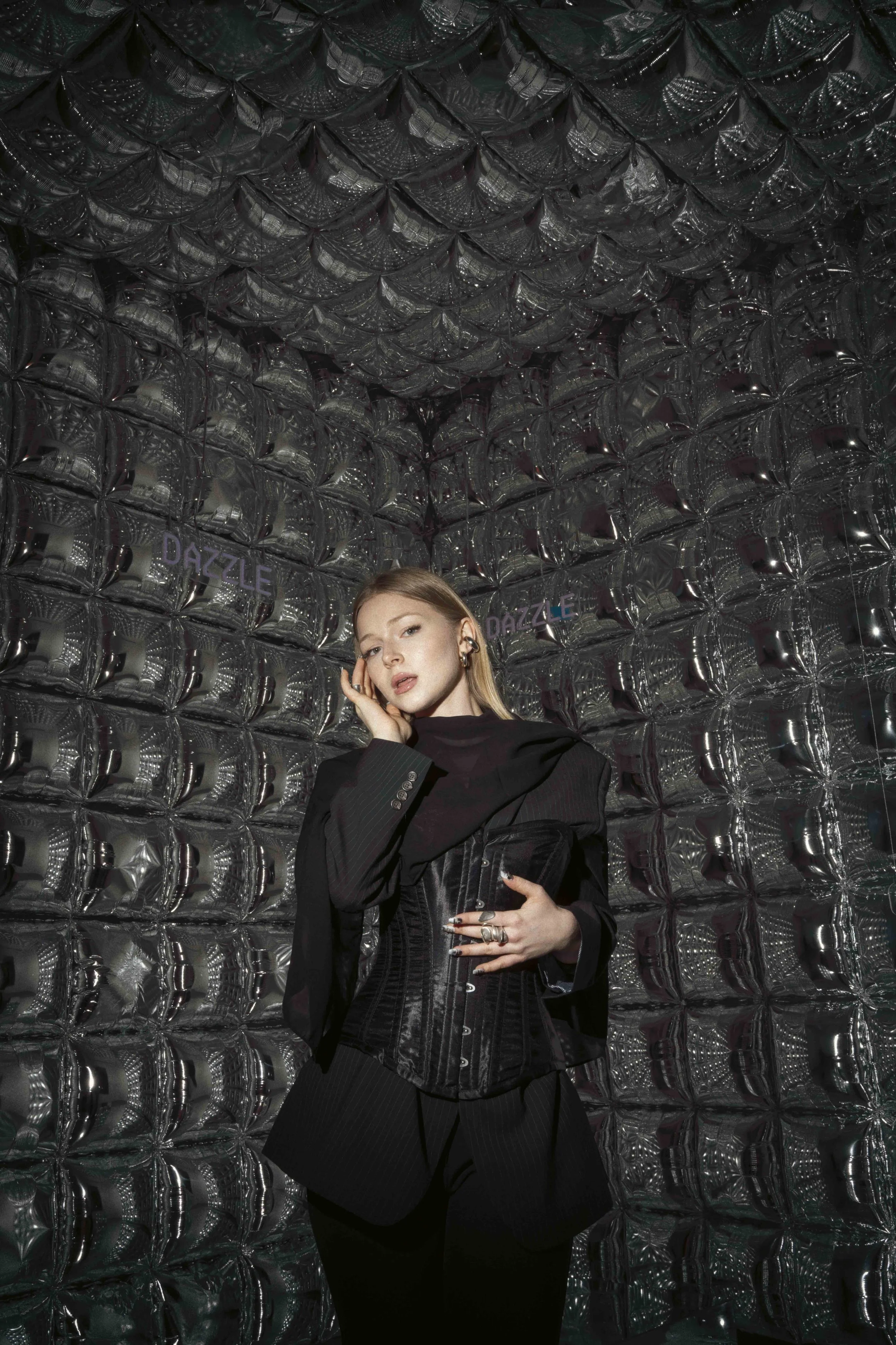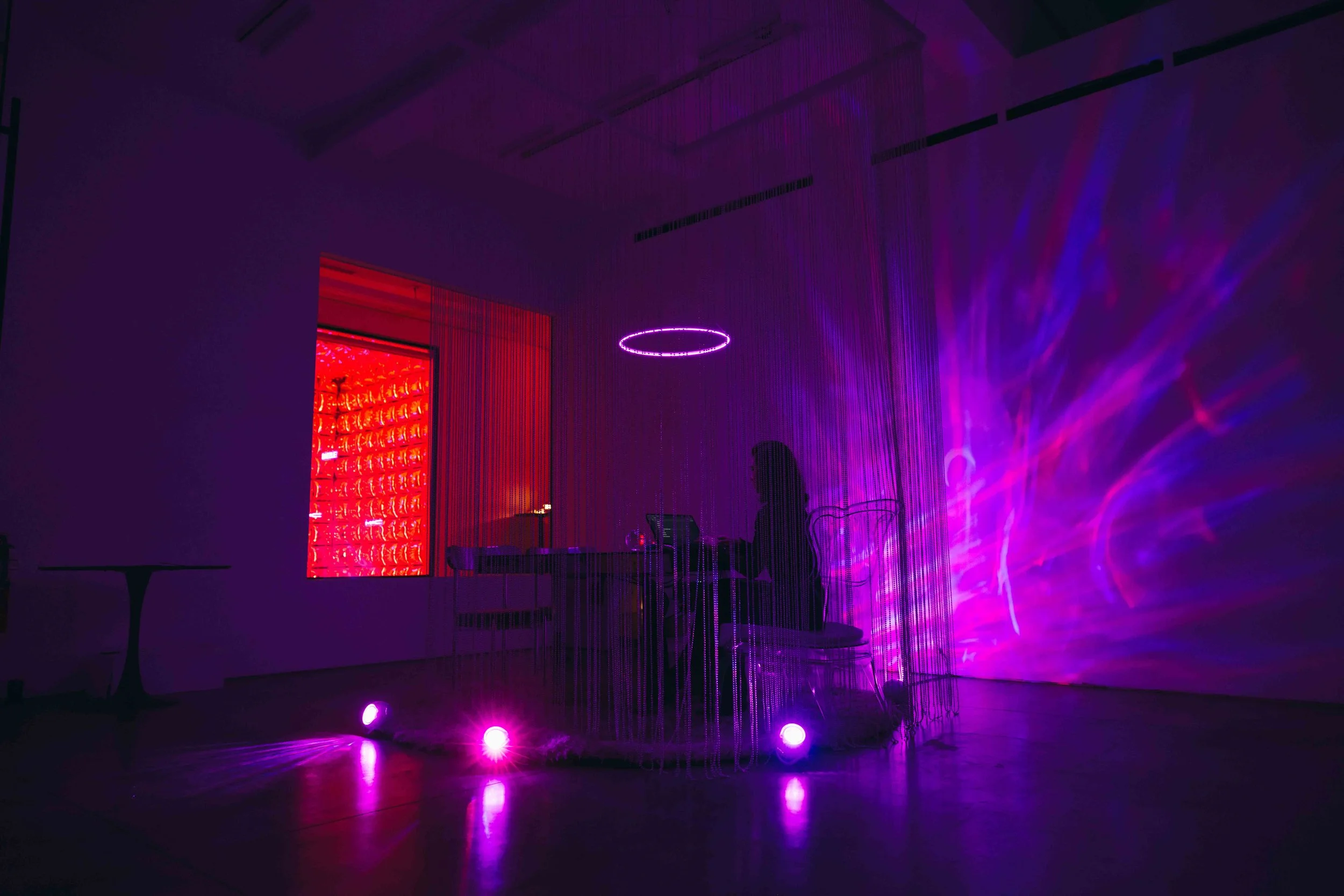 DJ Queen Niks played from an “exploded disco‑ball” booth with subtle M·A·C Dazzle brand projection, while a full bar and passed savory/sweet bites anchored the room. A luminous light tunnel drew guests onward, cueing exploration of the five‑room corridor of installations.